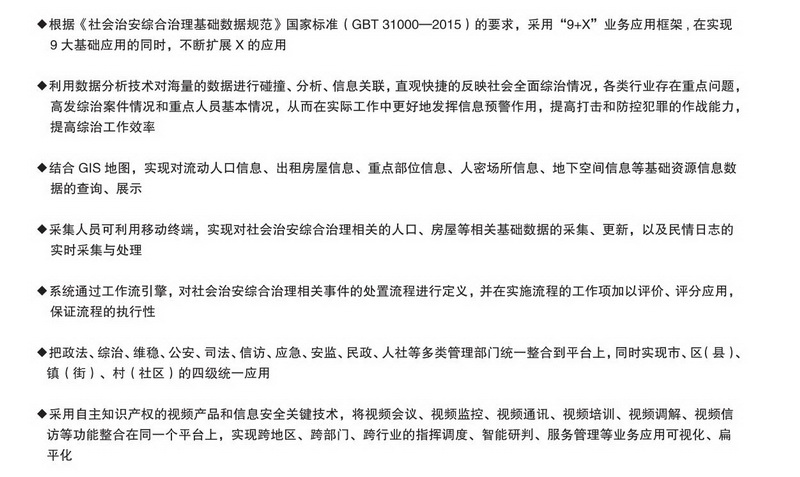 高科社会综合治理信息系统采用了现代先进的信息技术和现代管理理念,实现了面向市、区(县)、镇(街)、村(社区)多级综治部门综治信息化的需求,通过整合综治自身多个业务应用,建立综治信息基础数据仓库,开发出综治管理中极为重要功能模块。使各级综治组织通过信息采集、案件流转等,动态掌握人、地、物、事、组织等基础信息,同时整合公安、民政、司法、人力资源社会保障、住房城乡建设、卫生计生、安全生产监管等相关业务数据,进行数据交换、关联比对,实现综治相关数据资源互通共享。