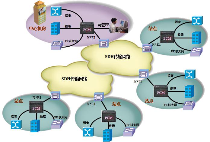 - PCM设备主要以E1链路作为承载通道,与SDH网络之间通过多E1捆绑的方式,将业务传输至SDH网络,并实现全网业务最终汇接至中心机房